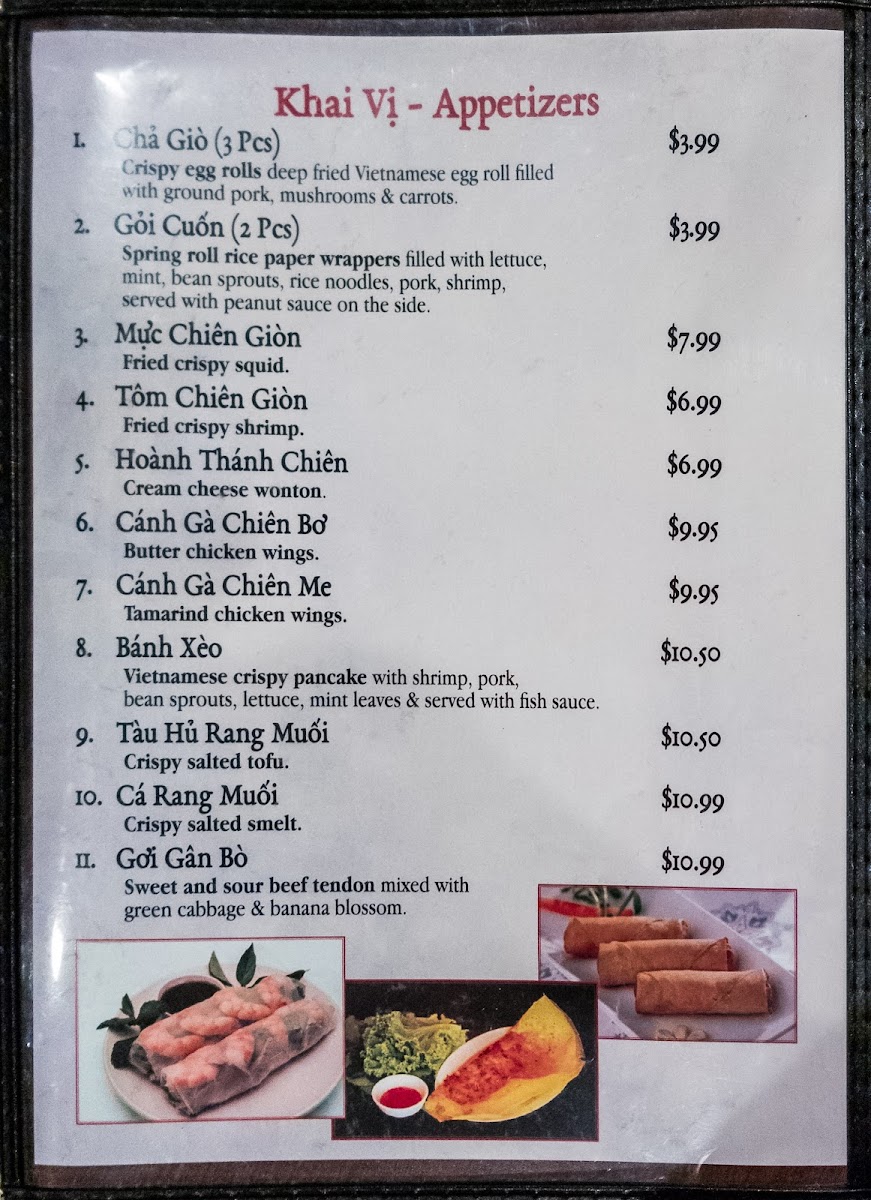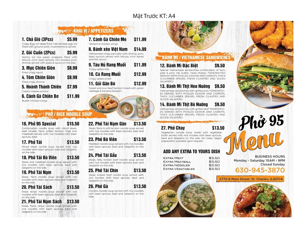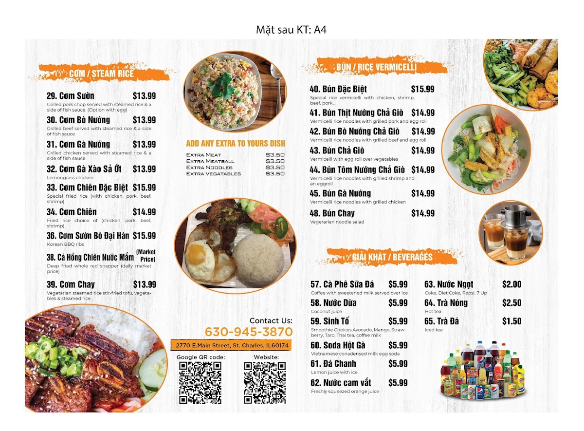 This menu is suitable for those seeking traditional Vietnamese meals for lunch or dinner, as well as light refreshments and beverages. It accommodates both quick orders and casual dining experiences.