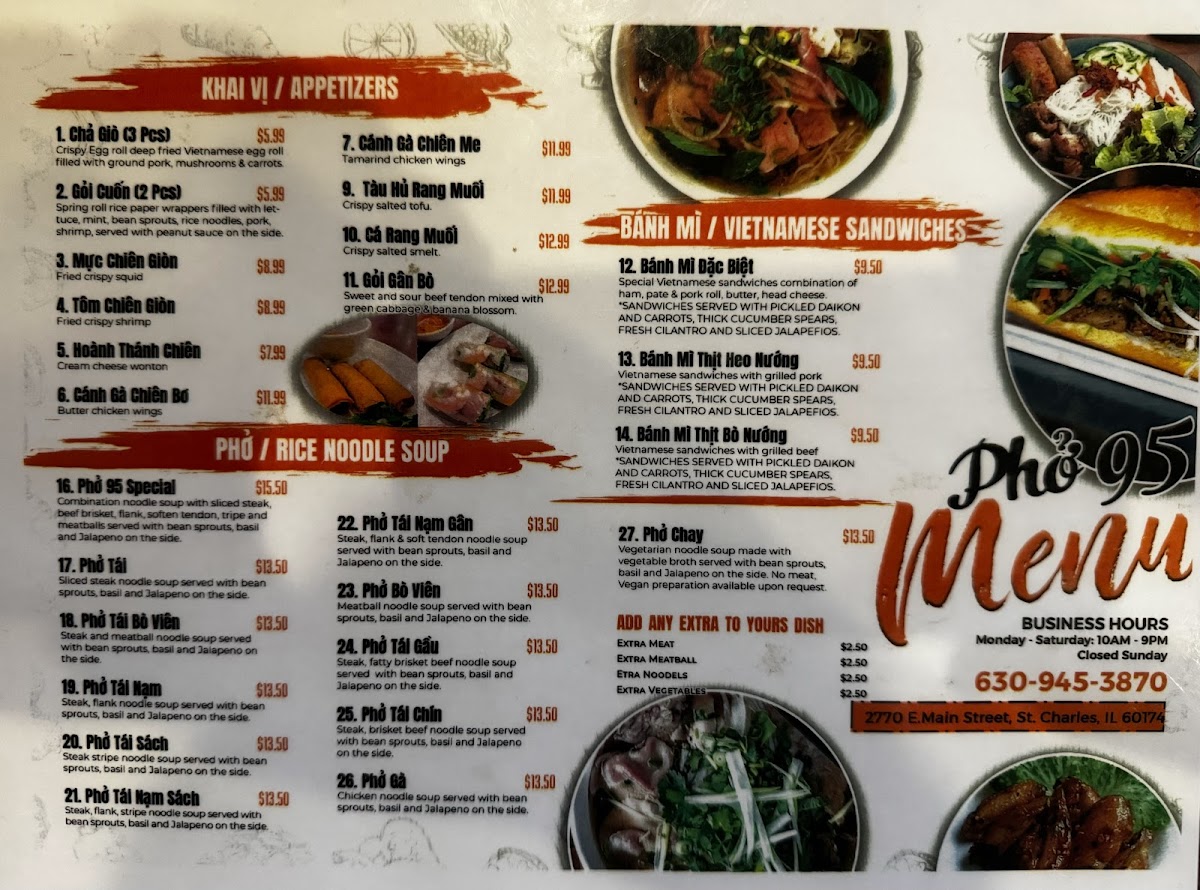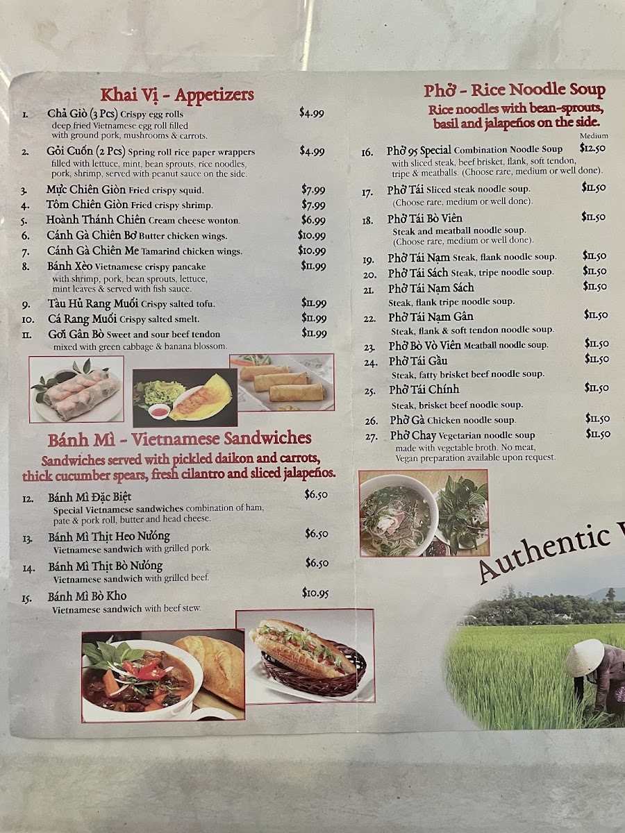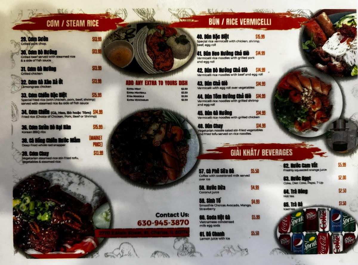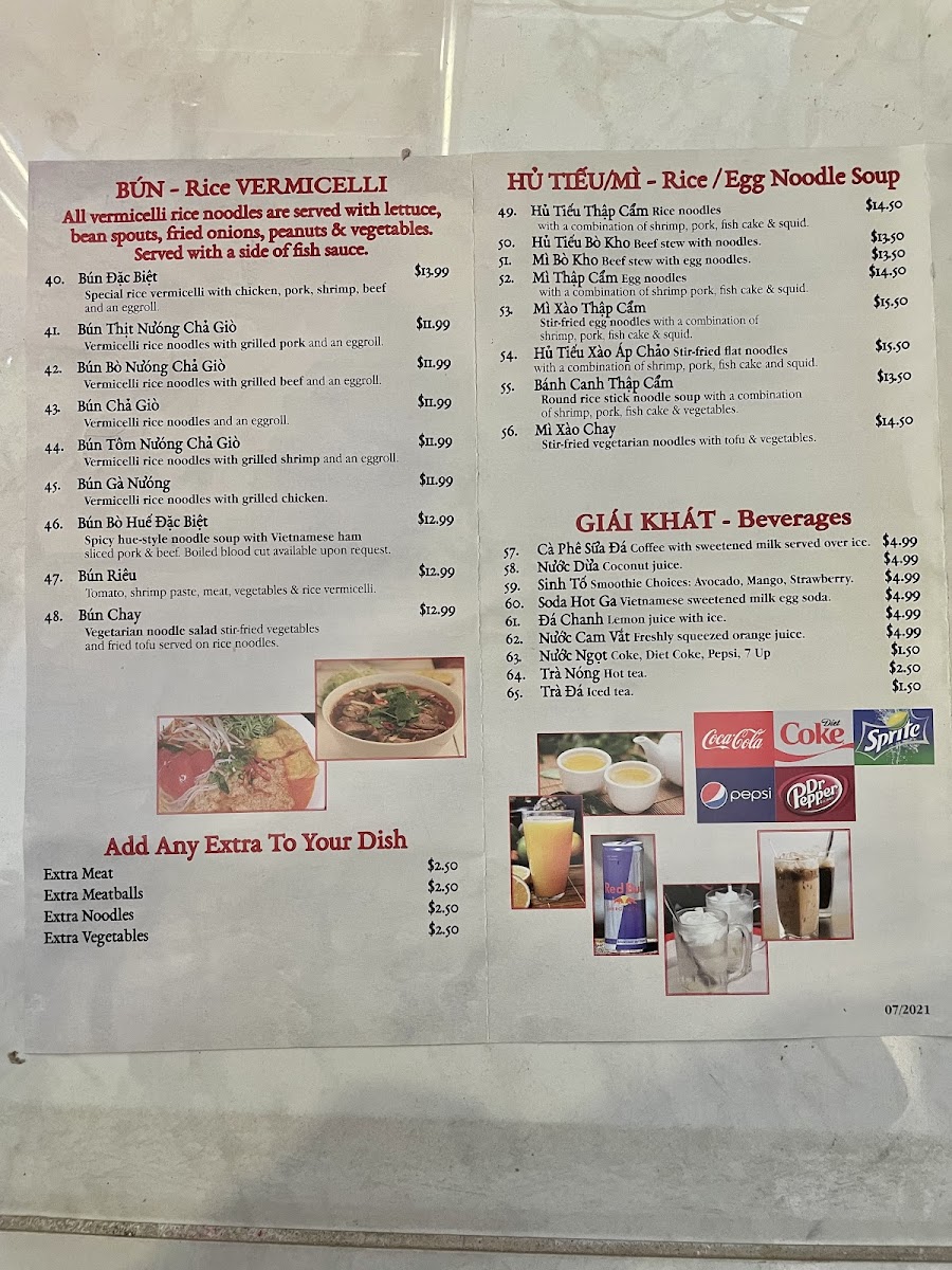 The menu offers a variety of traditional Vietnamese dishes and beverages, structured into clear categories to help guests easily find their preferred items. The main sections include drinks, rice vermicelli dishes, and Vietnamese sandwiches (Bánh Mì).