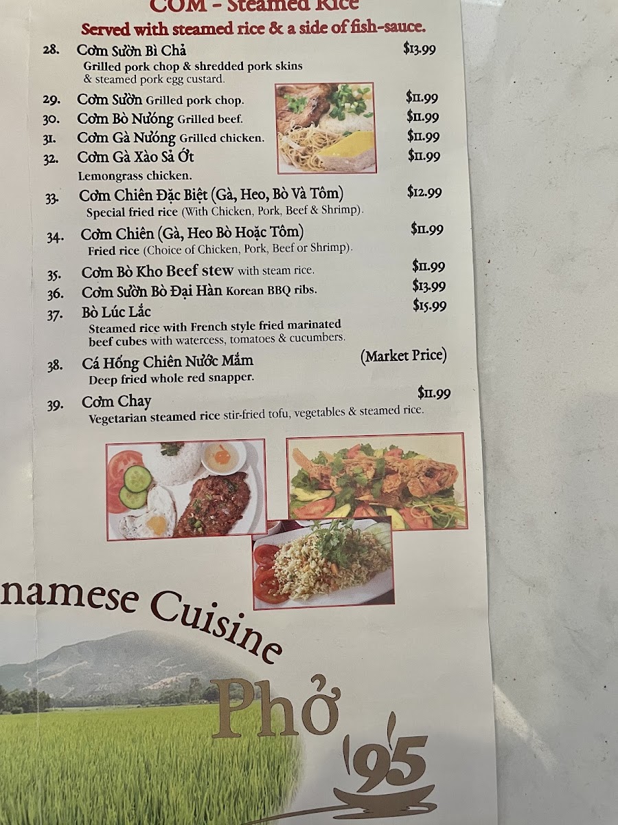 The Rice Vermicelli (Bún) dishes present a variety of noodle bowls served with proteins such as grilled pork, grilled beef, shrimp, chicken, and eggrolls. Combinations vary from special mixed plates to simpler servings, accommodating different tastes within the rice vermicelli category.